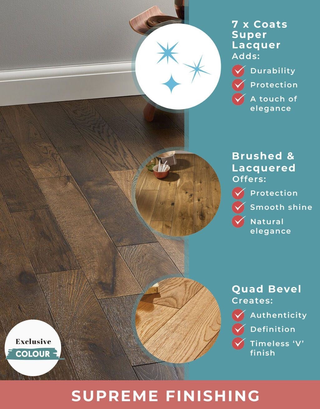 An elegant finish that's easy to clean and gives a perfect blend of smooth shine with enhanced natural wooden features